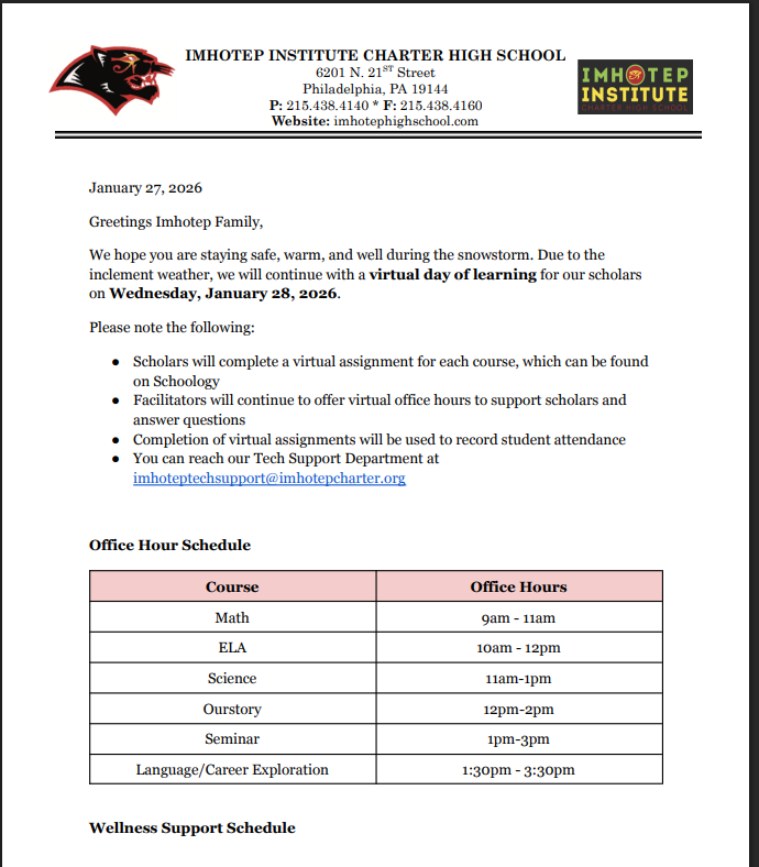 We hope you are staying safe, warm, and well during the snowstorm. Due to the inclement weather, we will continue with a virtual day of learning for our scholars on Wednesday, January 28, 2026.